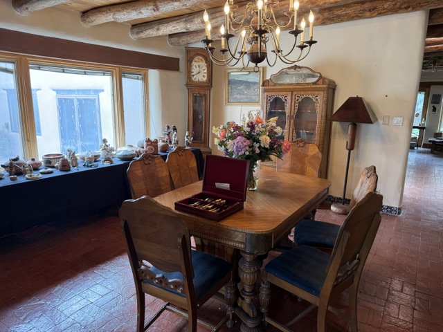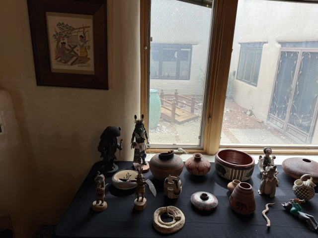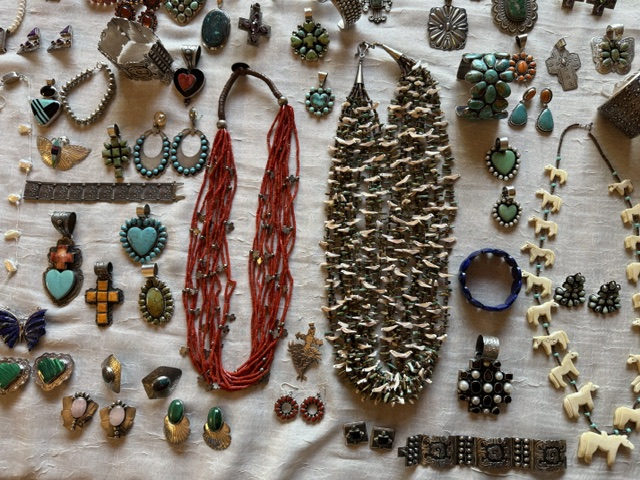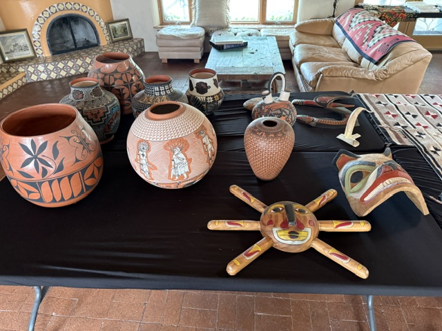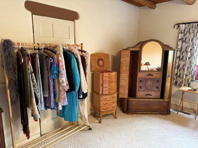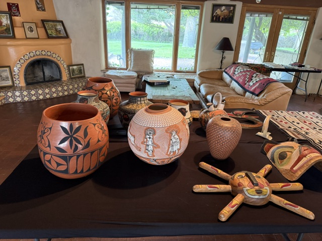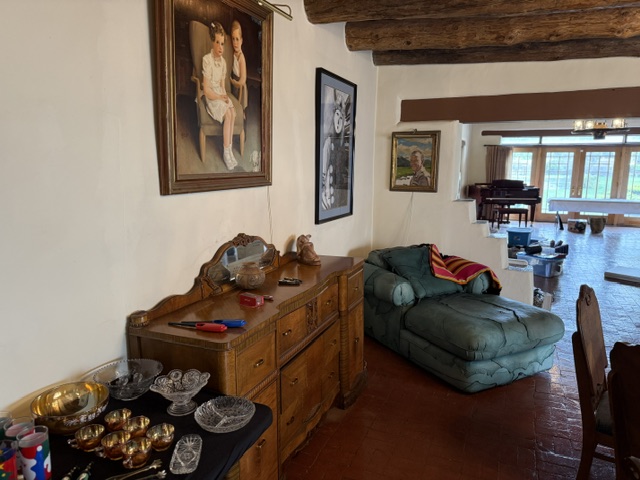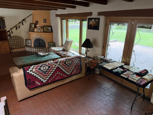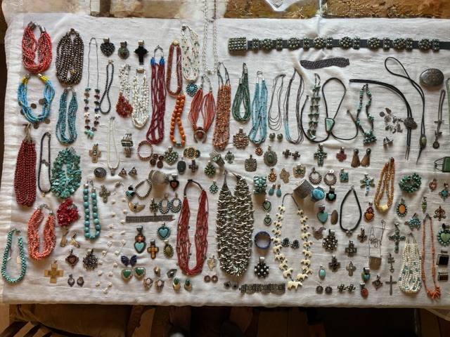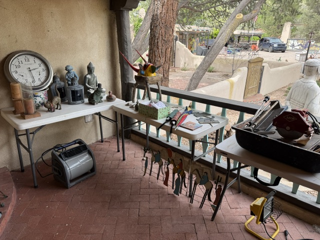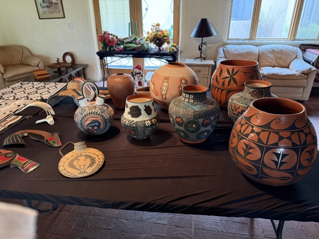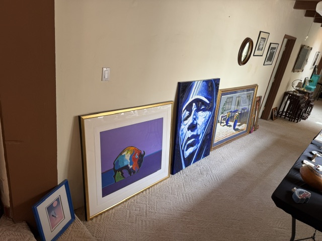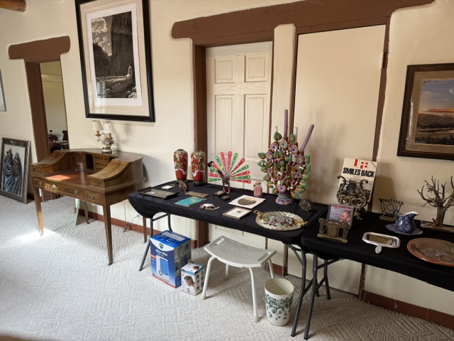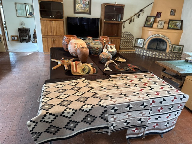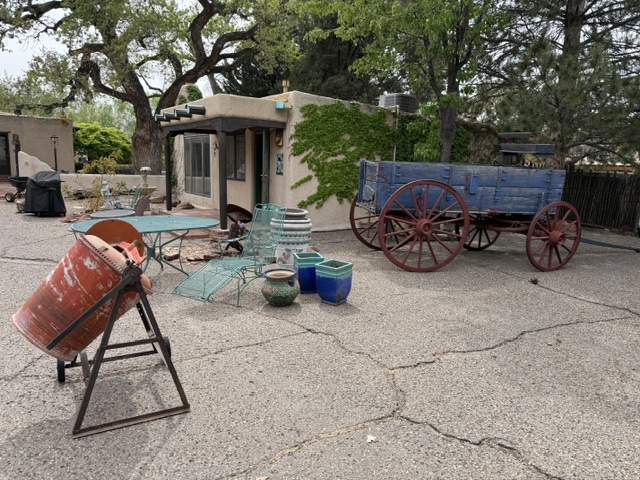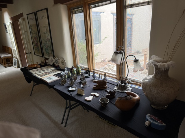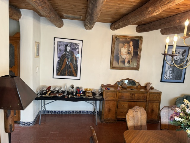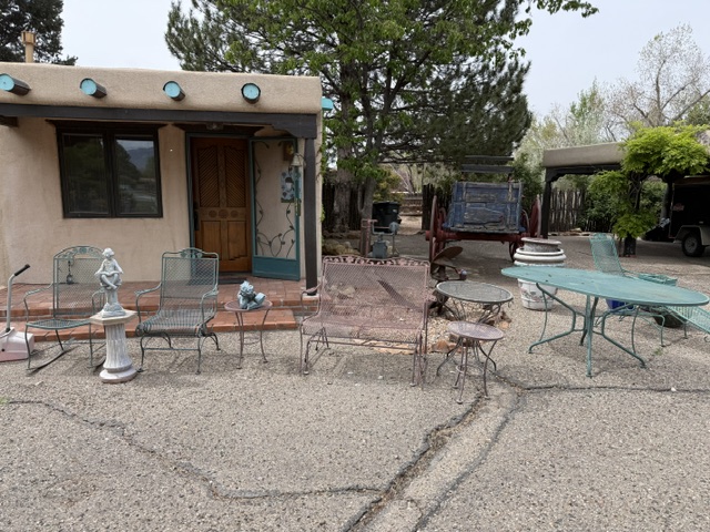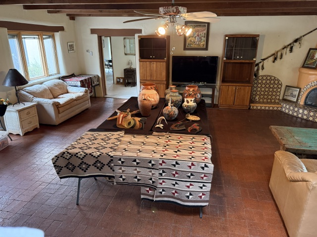 This huge home includes the finest of furnishings, art & collectibles! the yard is full of local art made of metal. lots of garden treasures including patio furniture. lots of Native American pottery, old & contemporary, art galore! painting & prints, top notch party wear clothing and a Tremendous amount of jewelry! Native, southwest & fine including some big names! high end household items and tools, life-size bronze Buddha & a stone one! cacti, leather couches & chairs, an amazing carved king size bed! bed ware an kitchenware, New Mexican religious carvings, office furniture, cabinets, desks, bookshelves etc. Kachinas & Navajo weavings, Antique horse drawn cart and much more!