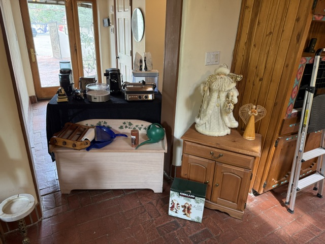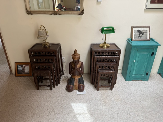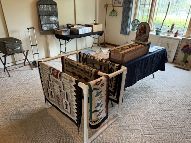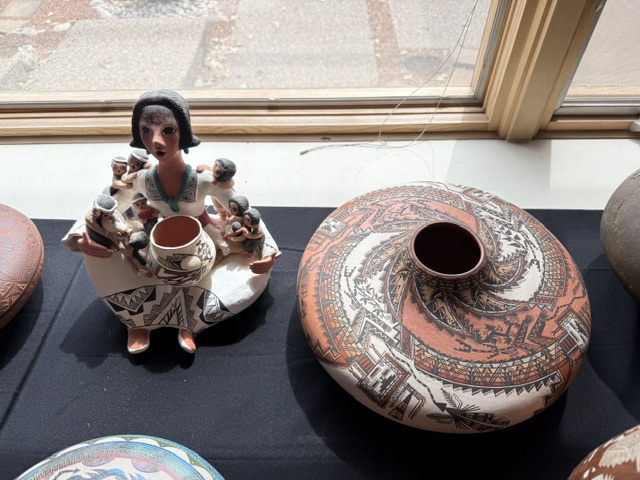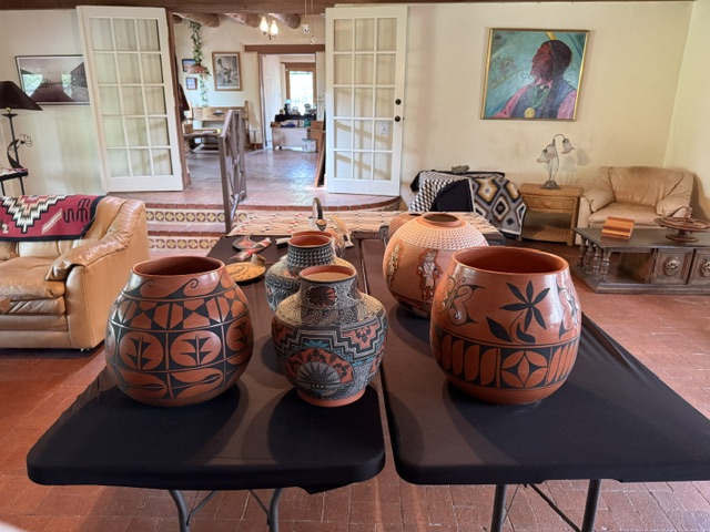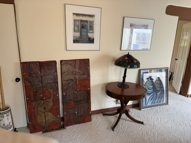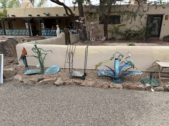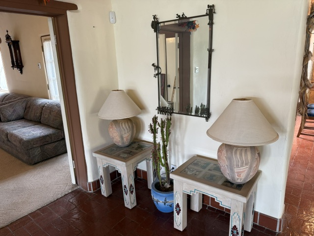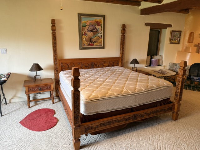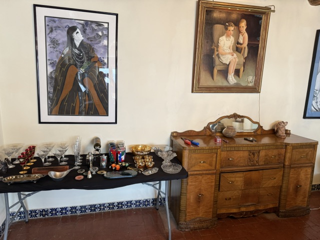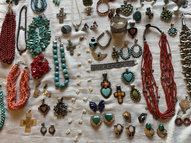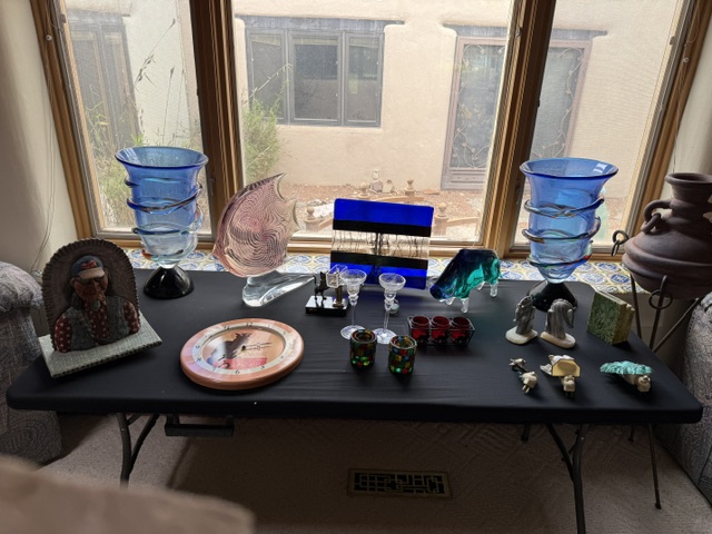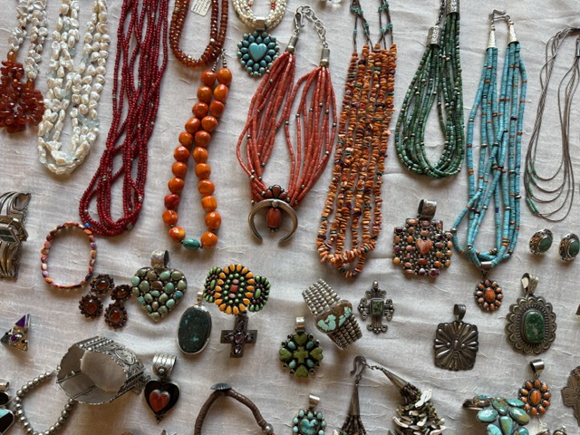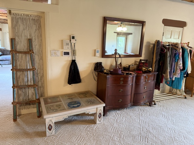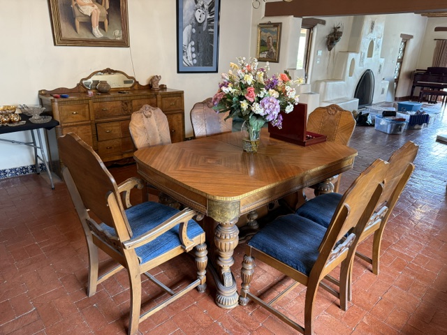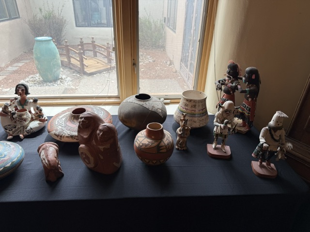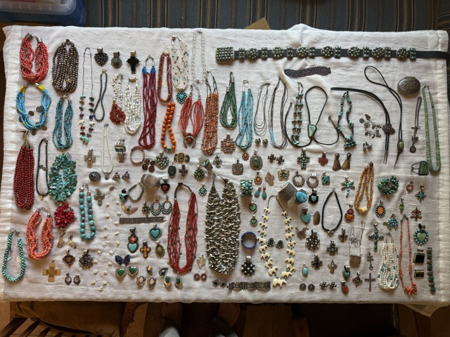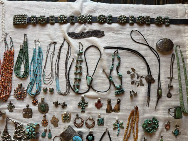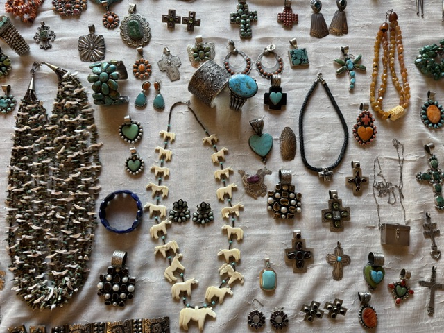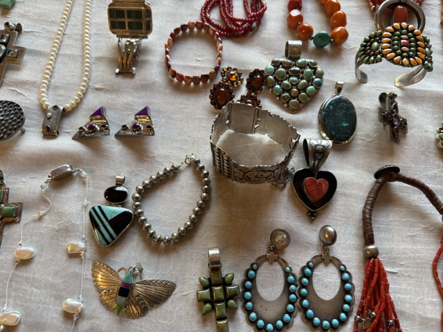 This huge home includes the finest of furnishings, art & collectibles! the yard is full of local art made of metal. lots of garden treasures including patio furniture. lots of Native American pottery, old & contemporary, art galore! painting & prints, top notch party wear clothing and a Tremendous amount of jewelry! Native, southwest & fine including some big names! high end household items and tools, life-size bronze Buddha & a stone one! cacti, leather couches & chairs, an amazing carved king size bed! bed ware an kitchenware, New Mexican religious carvings, office furniture, cabinets, desks, bookshelves etc. Kachinas & Navajo weavings, Antique horse drawn cart and much more!
